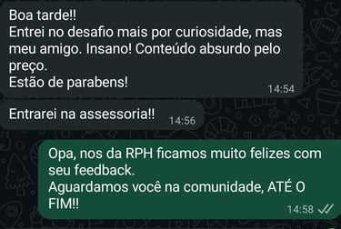 Ao concluir, você terá acesso a uma oferta exclusiva para entrar na Academia Híbrida RPH, com planos completos e personalizados para continuar sua evolução com o método.
